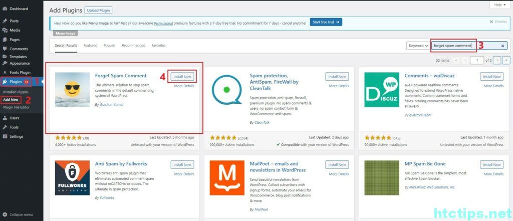 Chọn Plugins > Add New, nhập tìm kiếm “Forget Spam Comment”