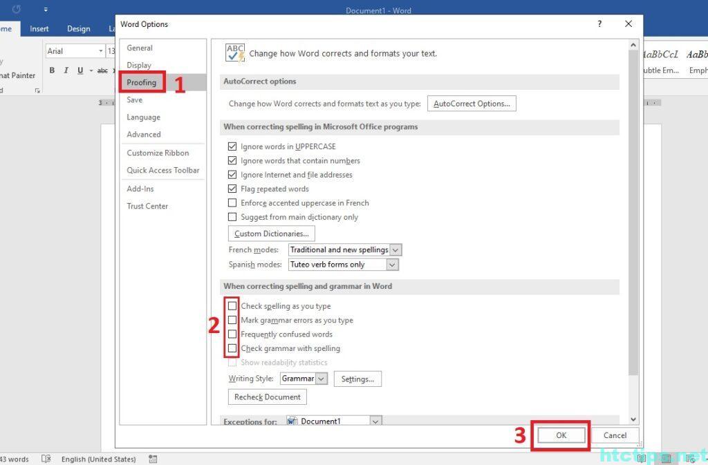 Chọn Proofing > Ngay tại mục ‘When correcing spelling and grammar in Word’ uncheck như hình phía dưới > OK.