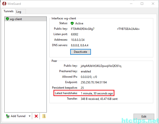 Khi tệp .conf đã được nhập, hãy nhấp vào nút Active để thiết lập kết nối. Nếu Latest handshake xuất hiện thì bạn đã kết nối thành công với Máy chủ WireGuard.