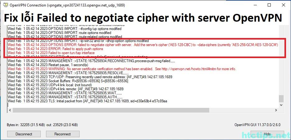 Hiển thị lỗi đầy đủ như sau: OPTIONS ERROR: failed to negotiate cipher with server. Add the server’s cipher (‘AES-128-CBC’) to –data-ciphers (currently ‘AES-256-GCM:AES-128-GCM’) if …